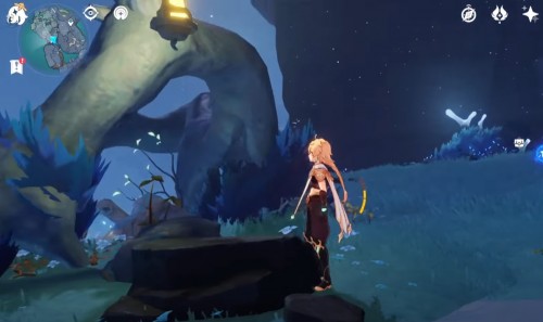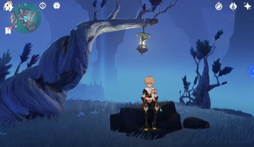 Садитесь на камень, а потом ждите появления комментария от Паймон, чтобы вам засчиталось это особое место. Затем можете взобраться на дерево, чтобы прочитать записку на лампе.