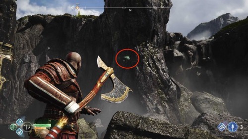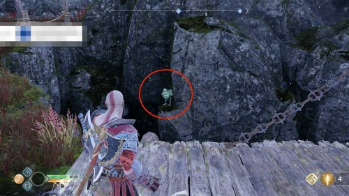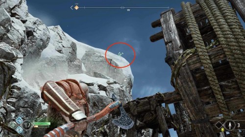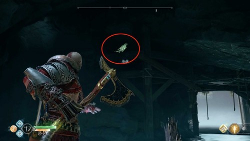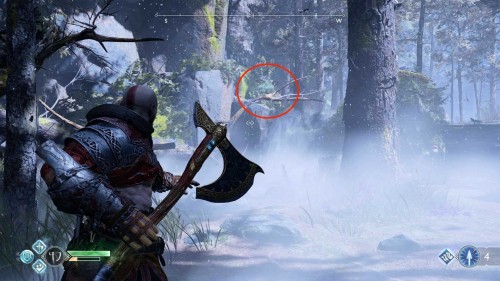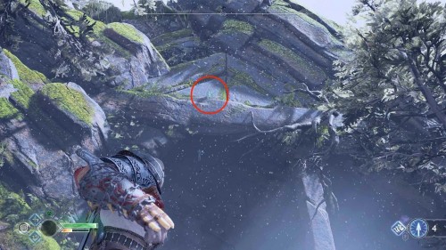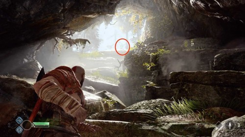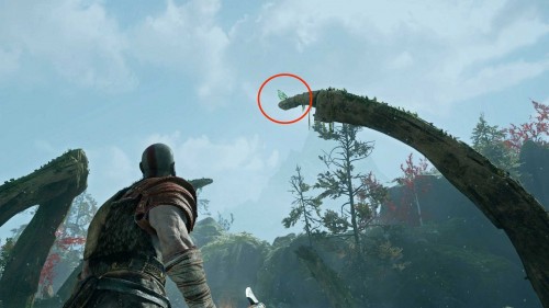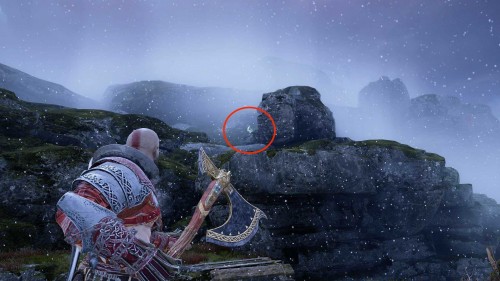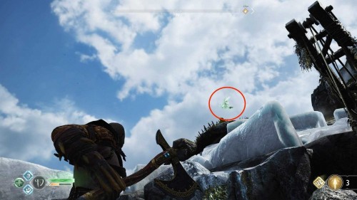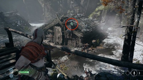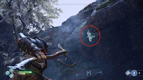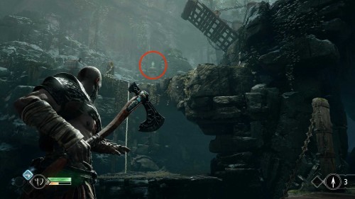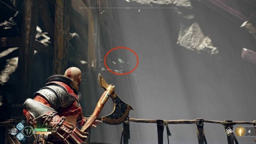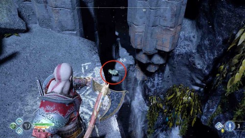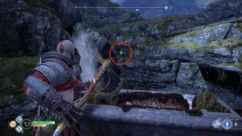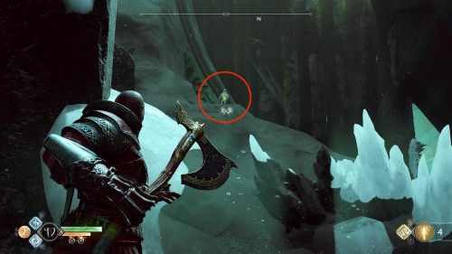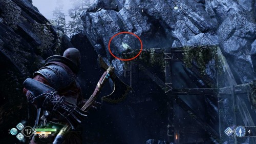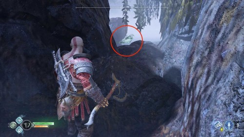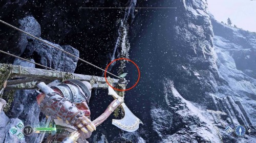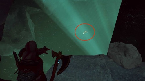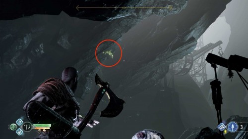 Пройдите по первому мосту и спуститесь дальше по нижним уровням Хельхейма. Когда спуститесь со скалы, которая приведет вас к большому пустому ледяному участку, посмотрите налево, и вы увидите ворона, летающего кругами под скалой.