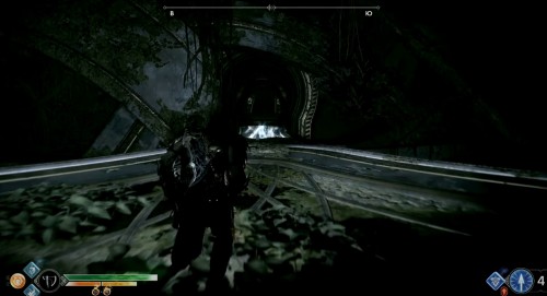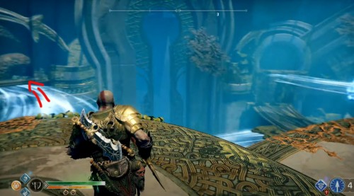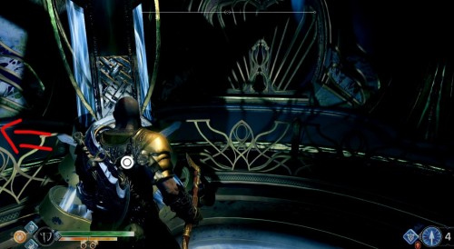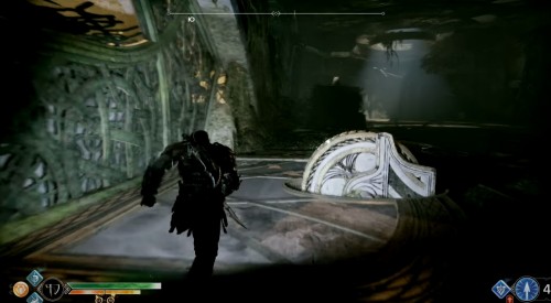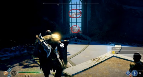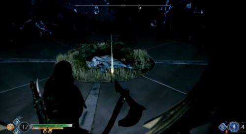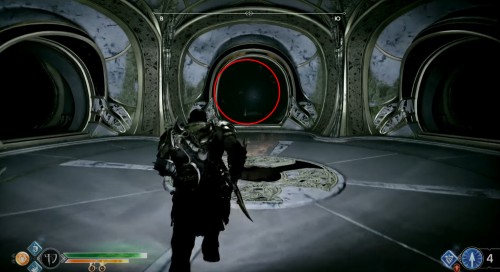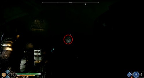 Добегите до колеса и взаимодействуйте с ним, чтобы спуститься вниз на подъемнике. Оказавшись внизу, бросьте топор в механизм, дабы заморозить его. Далее бегите вперед к следующему колесу. Здесь тоже будут три прохода. Идите в комнату посередине и найдите артефакт возле трупа эльфа.
