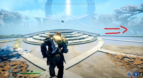 Направляйтесь в место, показанное на скриншотах ниже. Здесь вы ранее бились с одним из Древних. Вам нужно будет пройти по мосту из света, расположенному слева. В конце вы увидите светящийся маркер. Подберите очередной артефакт.