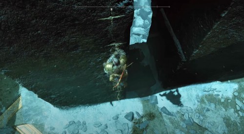 Направляйтесь в отмеченное на картинках ниже место и спуститесь вниз по каменной колонне. Оказавшись на дне, найдите разрушенный столб, на верхушке которого виднеются ветки. Уничтожьте их с помощью клинков хаоса, чтобы на землю упал очередной артефакт.