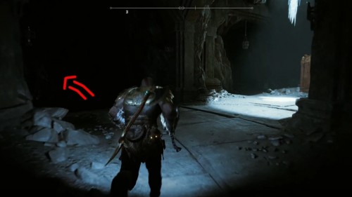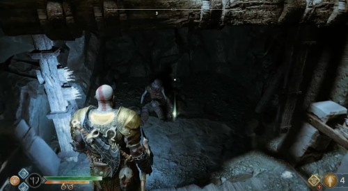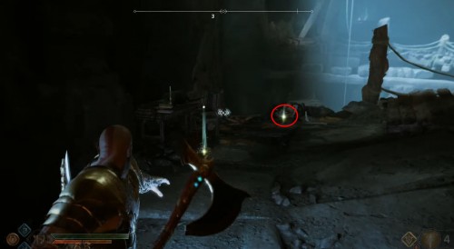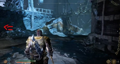 Продолжайте идти наверх к самой вершине, пока не дойдете до просторной области с огромным колесом, где вам нужно было воспользоваться вагонеткой по сюжету. От прохода в эту локацию сверните влево и двигайтесь по рельсам. С левой стороны вы обнаружите проход, который зарос красной смолой – уничтожьте его с помощью шоковых стрел Атрея. Затем пройдите внутрь и возьмите с земли артефакт.