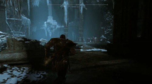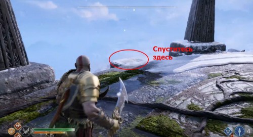 Возвратитесь на снежный край, с которого вы ранее спустились. Теперь вам нужно будет пробежать до конца к деревянным дверям. Откройте их и войдите внутрь. Спуститесь вниз с выступа по деревянной лесенке. Теперь сверните вправо и пройдите по деревянному мостику вперед.