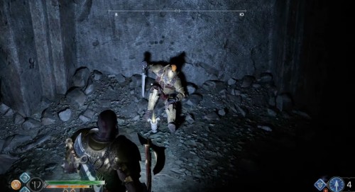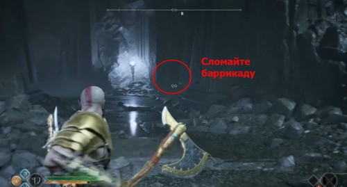 Теперь дойдите до факела с синим пламенем. Справа от него находится деревянная преграда, которую необходимо разрушить. Впереди вы увидите труп рыцаря, рядом с которым лежит артефакт.