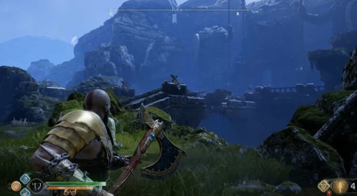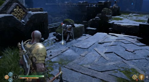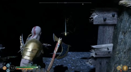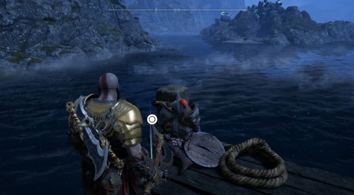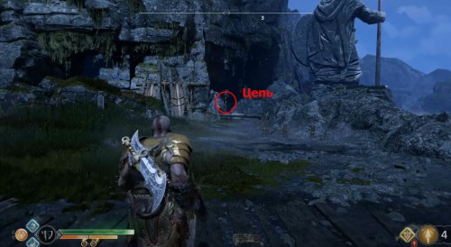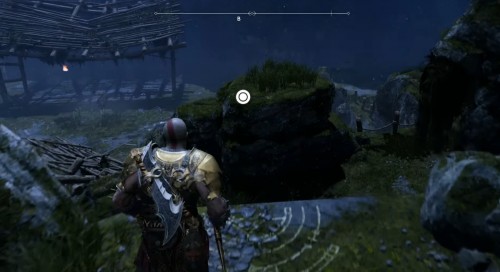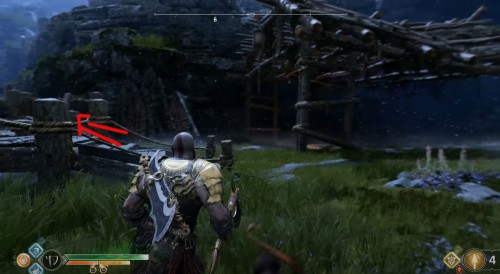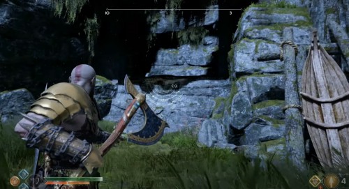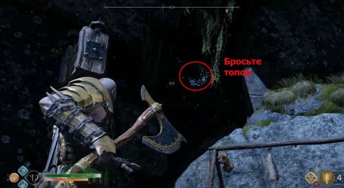 После нахождения предыдущего артефакта вернитесь на пляж с вашей лодкой. Встав спиной к судну, поверните направо и бегите до цепи впереди. Взаимодействуйте с ней и закрепите ее, бросив топор в руну наверху. В результате вы откроете проход возле лодочек, лежащих на берегу.