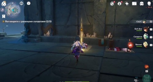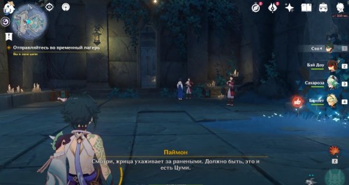 Попав в изменившийся регион, направляйтесь во временный лагерь и пообщайтесь там с Цуми. Затем поболтайте с воинами, которых серьезно ранили. Они все будут отмечены маркерами. Потом отойдите немного в сторонку и поговорите с Паймон. В конце снова побеседуйте со жрицей.