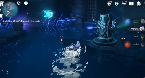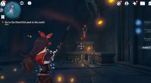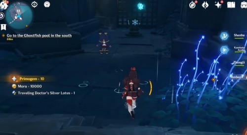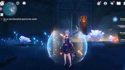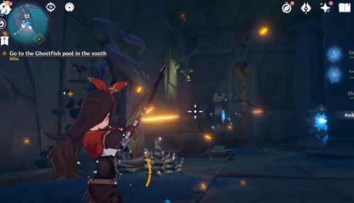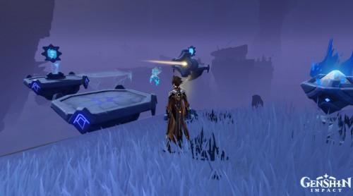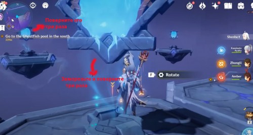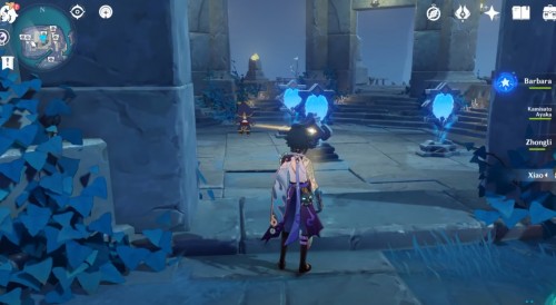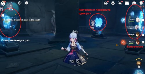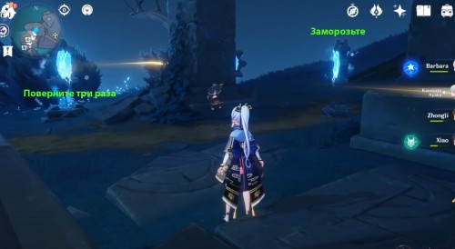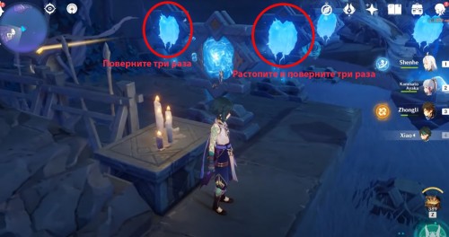 После открытия сундука советуем вам продолжить сопровождение феи до Крио монументов. Атакуйте их Крио атаками, чтобы открывать решетки. На выходе будут фазовые врата. Воспользуйтесь ими, чтобы подняться наверх и довести духа до «домика». В награду вы получите еще один сундук.