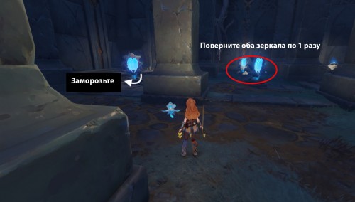Стоя спиной к передатчику света, пройдите вперед и поверните один раз зеркало справа от колонны. Затем заморозьте то, которое стоит позади колонны. Теперь растопите и поверните один раз зеркало, стоящее слева от колонны, рядом с приемником света. Далее запустите луч с помощью шкатулки.