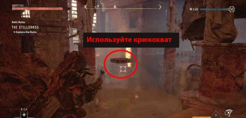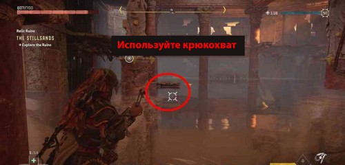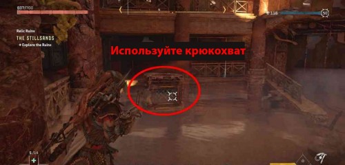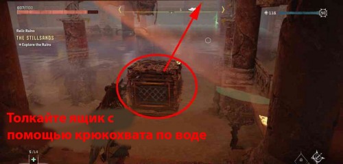 Вначале встаньте у подножия колонны, на которую можно взобраться, прямо перед складом. Потяните ящик туда. Вы не сможете толкать коробку по воде, поэтому придется стоять на земле и применять крюкохват.