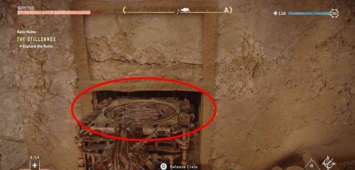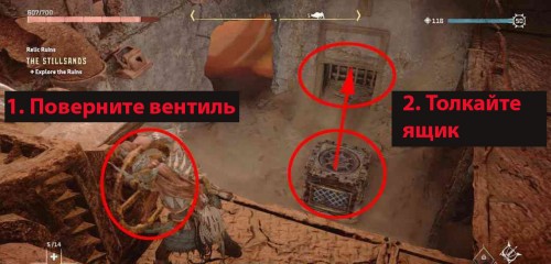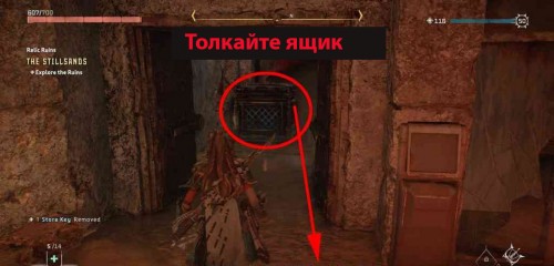 Вытолкните вторую коробку из склада и бросьте ее в воду. Ваша цель – доставить ее до противоположной стороны руин (южная часть). Затем вы сможете забраться на ящик в воде и оттуда допрыгнуть до желтого выступа, который позволит вам добраться до реликвии. Чтобы переместить коробку туда, нужно будет перетаскивать ее из одной точки в другую (L2 + треугольник > удерживайте R2), находясь на суше и используя крюкохват.