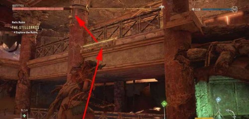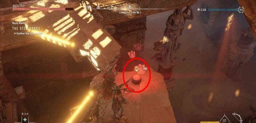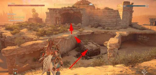 Начните поиски с северной части руин и пройдите через сломанную стену. Можете подняться наверх, взобравшись на кучу обломков. Спрыгните вниз на самое дно. Используйте щит-крыло, чтобы избежать урона при падении.