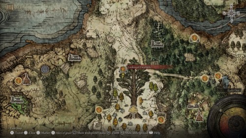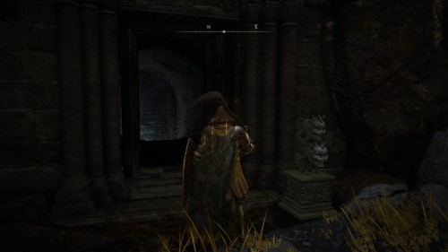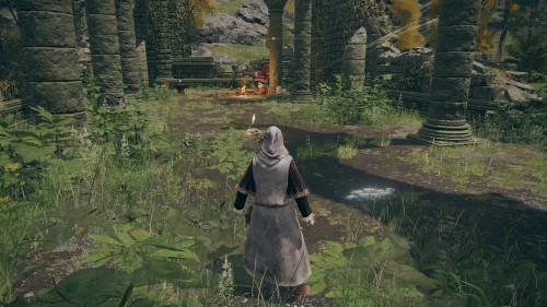 Двигайтесь дальше на север по тропе, следуя за указателем стрелки благодати на карте. Она показывает, где находится следующее место отдыха. Вы найдете его рядом с небольшим аванпостом солдат, известным как Руины у ворот. Вы можете избежать всех врагов, используя скрытность и обходя лагерь с края, однако внутри можно найти несколько хороших предметов, в том числе сундук в подвале и два сундука на задней части большого фургона.