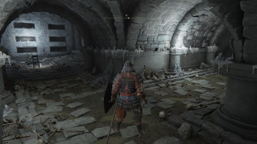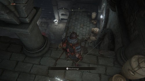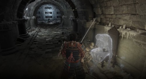 Когда пройдете через дверь, спуститесь немного, и вы увидите здесь место благодати. Активируйте его и продолжайте двигаться вниз по узким коридорам. Неподалеку будет сидеть неагрессивный дух. Он не сообщит ничего путного. Пройдите вперед, и вы достигните первой развилки. Если пойдете прямо, то попадете в помещение с пустым стулом и телом. Слева на вас сразу же выскочит бес, поэтому будьте осторожны (идите вперед с поднятым щитом или блоком).