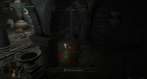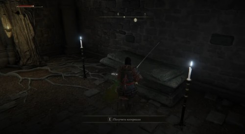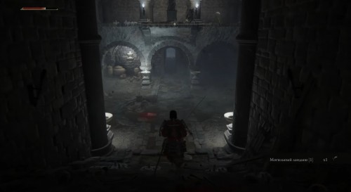 Впереди рядом с телом будет еще один бес. Расправьтесь с ними, а потом осмотрите труп на полу для получения Смолы из корня х2. Вернитесь чуть назад и теперь поверните направо. Спуститесь по лесенке. Вы попадете в помещение с закрытой дверью и постаментом для призыва. Справа возле каменного гроба можно найти Могильный ландыш [1], необходимый для прокачки духов из праха.