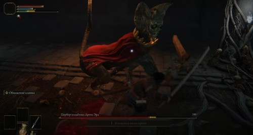 Цербер начинает парить в воздухе, когда вы стоите вдалеке от него или атакуете его с тыла. После прыжка враг всегда приземляется, ударяя мечом в землю и создавая небольшую ударную волну. В этот момент нужно совершить кувырок в сторону. Продолжайте использовать защитную стойку, пока враг не перестанет летать, а уже потом атакуйте.