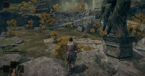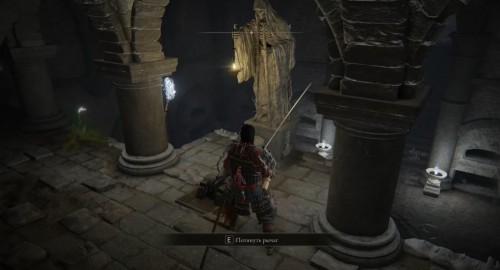 Возвратитесь в просторную локацию и спрыгните на выступ с правой стороны (смотрите скриншот ниже). Там вы обнаружите рычаг возле статуи. Потяните его, чтобы открыть большую дверь, которую вы видели ранее. Не забудьте подобрать Могильный ландыш [1], растущий слева, однако будьте осторожны, так как на вас внезапно нападет бес.