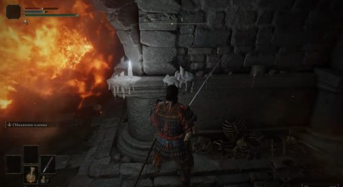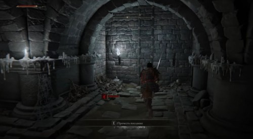 Возвратитесь к следующему коридору со второй огненной ловушкой. Снова укройтесь в проходе впереди, а потом доберитесь до каменной колонны и ударьте по ней, чтобы опустить ее. На стене будут висеть бесы. Расправьтесь с ними (можете использовать огненную ловушку), а потом подойдите к дальнему левому углу, чтобы собрать с трупа Тлеющую бабочку х3 и Призрачный ландыш [1].