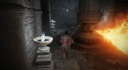 На нижнем уровне возле колонны можно, кстати, отыскать еще один Могильный ландыш [1] и Могильную фиалку (фиолетовый цветок). Разобравшись с врагами, пройдите через узкий тоннель впереди. Справа вы увидите более широкий туннель с огненной ловушкой, выпускающей пламя через короткие промежутки времени. Однако у вас будет достаточно времени, чтобы пробежать по коридору и спрятаться в правом проходе.
