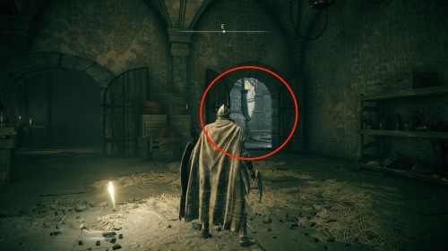 Бегите вперед, сражаясь с различными врагами или проходя мимо них, пока не дойдете до просторной локации. Сверните влево (на восток) и войдите в большую каменную постройку, перед входом в которую стоят статуи рыцарей. Внутри тоже будут статуи. Двигайтесь дальше наружу.