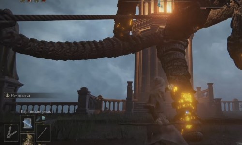 Когда враг будет топать, просто совершайте кувырок, дабы не получить урон. Разобравшись с ним, воспользуйтесь телепортом в конце моста и переместитесь на другую сторону. Тем самым вы попадете в Священную башню Замогилья.