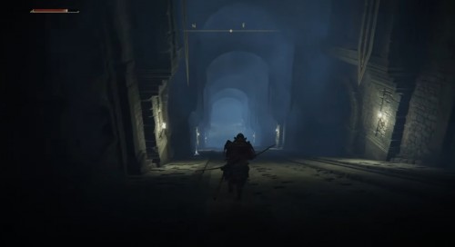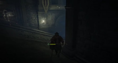 Возвратитесь назад к развилке и теперь спуститесь влево по склону. Справа на вас нападет еще один арбалетчик и мечник со щитом. Чуть ниже будет лежать труп, с которого можно собрать Могильный ландыш [1]. Вскоре в центре дорожки появятся сразу 4 врага: один воин с арбалетом и три с мечом. Их можно легко обойти, пробежав мимо них и повернув направо в нижней части склона. Там будет золотая завеса, за которой находится босс.