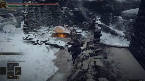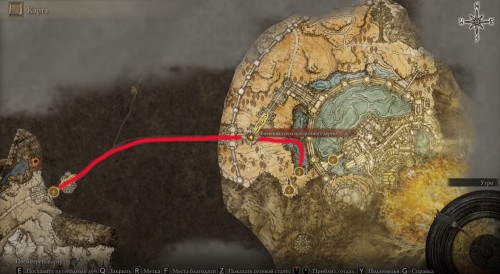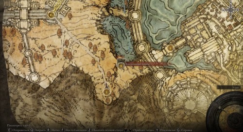 Улучшать свое оружие и щиты можно уже в самом начале игры, воспользовавшись столом кузнеца, расположенным в Храме Элле, которая находится неподалеку от Плавающего кладбища. Расположение данного места показано на скриншотах ниже. Для заточки вооружения вам потребуются кузнечные камни и определенное количество рун.