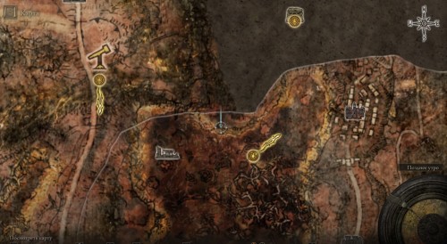 Кузнечный камень мрака [6] можно найти на трупе, сидящем на стуле посреди скал, неподалеку от Первого лагеря на горе Гельмир. Еще два можно отыскать в Старом туннеле Альтуса, но для прохода в него вам придется потратить два мечевидных ключа. Опять же используйте для поисков интерактивную карту мира.