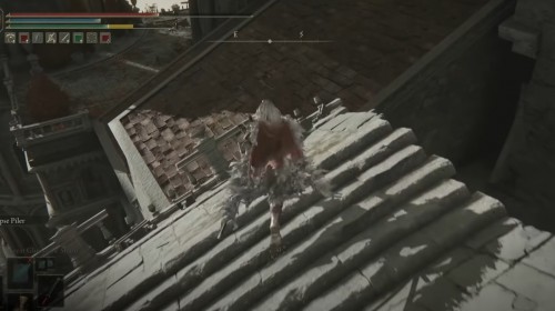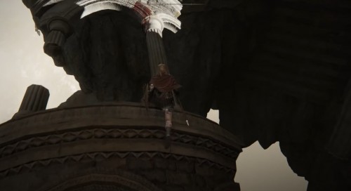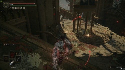 Сражаться со всеми этими монстрами необязательно, однако обойти их будет непросто. В определенный момент вам нужно будет подняться по большой закрученной лестнице. Не дойдя до самого верха, спрыгните слева на остатки каменной площадки внизу (смотрите скриншоты ниже). Далее идите через короткий туннель и снова выйдите наружу.