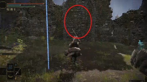 Продолжайте бежать вперед, пока не дойдете до иллюзорной стены, показанной на скриншоте выше. Стукните по ней, чтобы она исчезла. Сразу за ней будет место благодати Дорога к поместью. Слева на камне будет сидеть великан с книжкой. Именно у него вы и сможете покупать любое количество кузнечных камней мрака [1] и [2] за 2000 и 3000 рун соответственно. Добавим, что у него можно также взять по 3 кузнечных камней мрака [3] и [4].