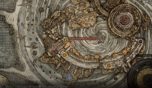 Чтобы Старые служанки-близнецы начали продавать эти предметы, вам нужно будет отыскать Мрачную кузнечную колокольную сферу рудокопа [5]. Она тоже находится в Разрушенной Фарум-Азуле. Доберитесь до точки, показанной на карте ниже, и пройдите по поваленной башне на другую сторону.