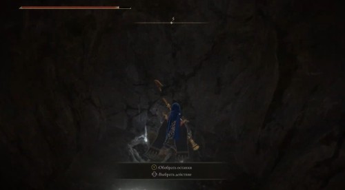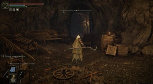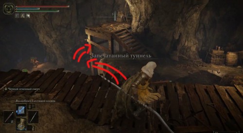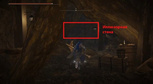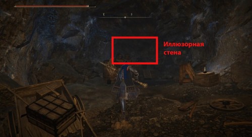 Пройдите внутрь и активируйте место благодати. Поначалу шахта может показаться пустой. Однако на деле здесь просто стоит иллюзорная стена, за которой скрывается проход. Ударьте по месту, показанному на скриншоте ниже (мы уже убрали стену), чтобы увидеть коридор. Двигайтесь вглубь пещеры.