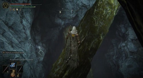 Воспользуйтесь подъемником, чтобы спуститься еще ниже. Пройдите под корнями к следующей иллюзорной стене. Ударьте по ней и двигайтесь дальше. Возле трупа с руной жителя окраин [4] разрушьте еще одну стену. В результате вы окажитесь в просторной локации с корнями. Вам нужно будет дойти до прохода на противоположной стороне. Постарайтесь не упасть, так как внизу опасный враг.