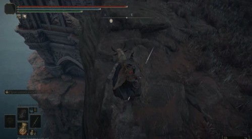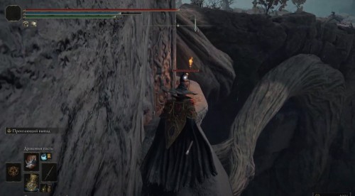 Возле нее не будет никаких мостов или проходов, однако на краю обрыва слева можно увидеть огромный корень. Переместитесь на него и двигайтесь в сторону сооружения. Затем спрыгните на каменный уступ внизу, как показано на картинках. Идите вперед вдоль стены и разберитесь с первым противником. Далее поднимитесь по двум деревянным лесенкам.