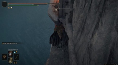 Перепрыгните через вторую дыру и продолжайте идти по выступу. Разберитесь с новым врагом. Далее будут сразу два разрушенных участка. Советуем вам перепрыгнуть их на лошади. При спуске вам придется преодолеть еще одно отверстие. Здесь будет достаточно обычного прыжка. Вскарабкайтесь по очередной деревянной лесенке.