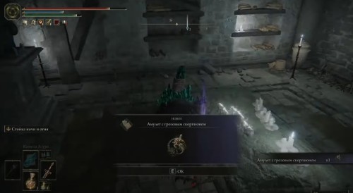 Поднявшись, подойдите к статуе беса и используйте мечевидный ключ, чтобы убрать туман. Возле гроба вы сможете найти Амулет с грозовым скорпионом. Теперь пройдите в другую просторную комнату. В ней поднимется пол. Идите дальше в коридор и взаимодействуйте с рычагом. Теперь вернитесь к началу и пройдите через золотую пелену, чтобы столкнуться с боссом Цербер кладбища Древа Эрд. Разберитесь с ним, чтобы получить нужный предмет.