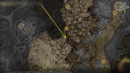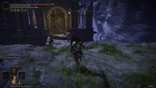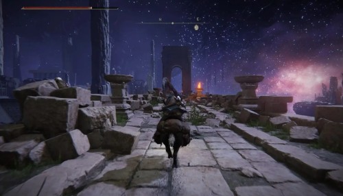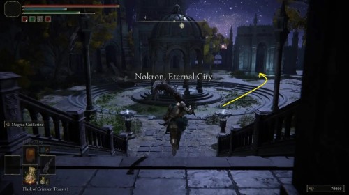 Теперь спрыгните вниз и двигайте прямо, чтобы дойти до места благодати «Нокрон, Вечный город». Пройдите через открытую дверь, и вы окажитесь на площади с беседкой, а потом идите через ворота справа.