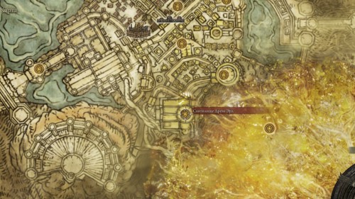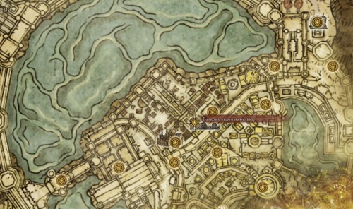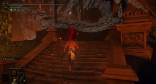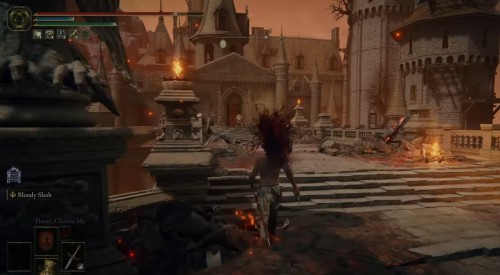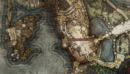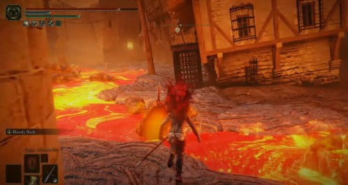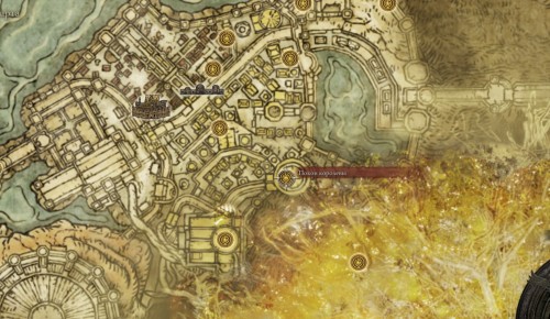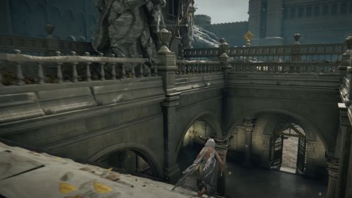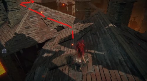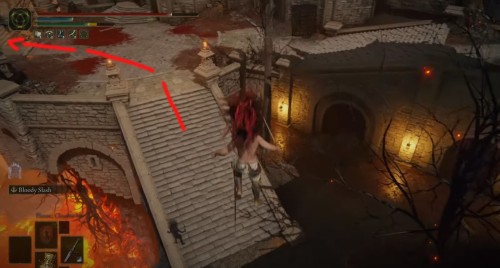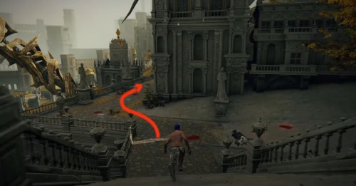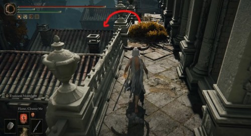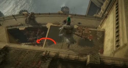 Переместитесь к месту благодати «Балкон с видом на бульвар» в столице Лейнделл, а затем поверните вправо и спуститесь по лестнице вниз, чтобы пройти через решетчатые ворота. Выйдя через них, сразу же сверните влево. Пройдите немного вперед и перепрыгните через периллы на крыши зданий слева внизу. Затем спуститесь на землю.