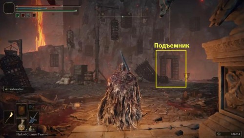 Далее сверните вправо и спуститесь по деревянной лесенке к лаве. Пройдите вперед и сверните вправо, чтобы подняться по склону наверх. Там войдите в подъемник. Выйдите из лифта и взберитесь по ступенькам, дабы попасть в Храм Игли. Тут вы и столкнетесь с нужным противником.