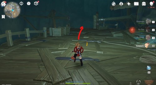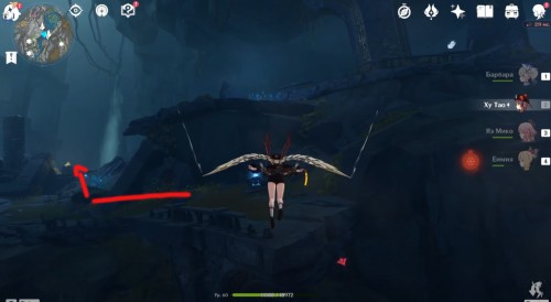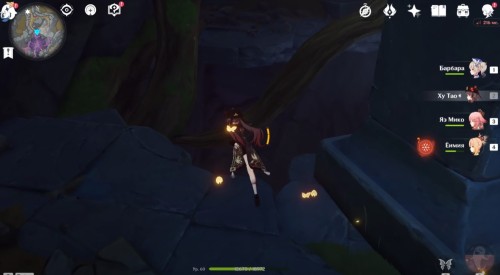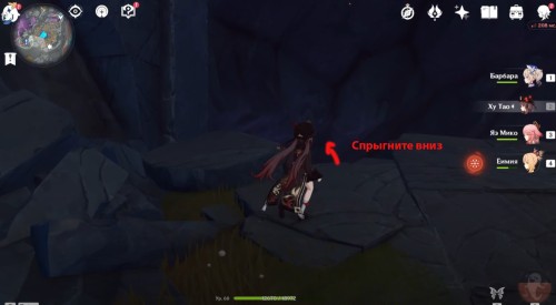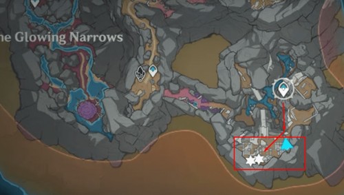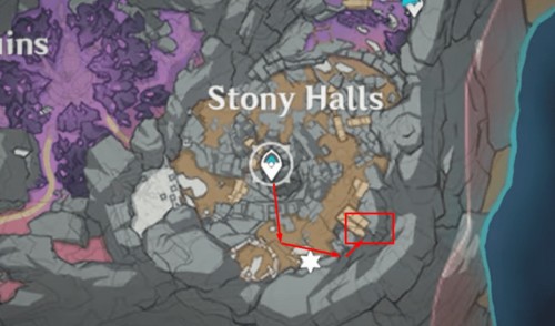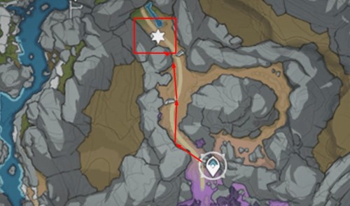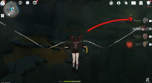 Переместитесь к северному телепорту Основной зоны добычи. Вам нужно будет пробраться в пещеру, расположенную в северо-восточном углу карты. Весь маршрут показан на скриншоте ниже. Сверните влево и поднимитесь по лесенке, а затем добегите до края деревянной платформы и спланируйте вниз к проходу на северо-западе.