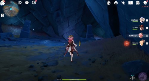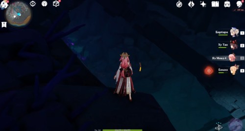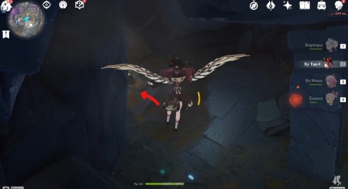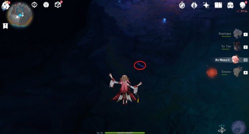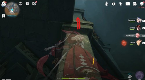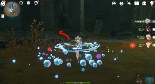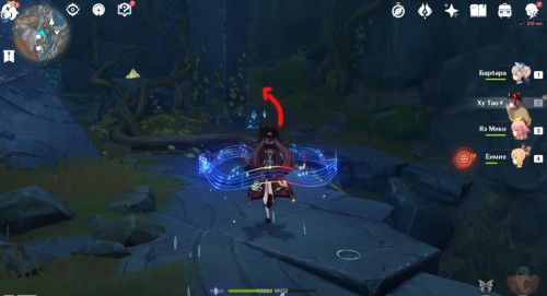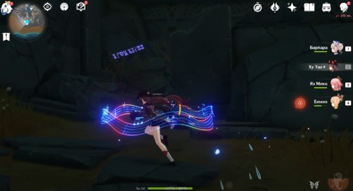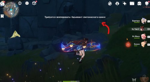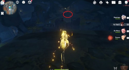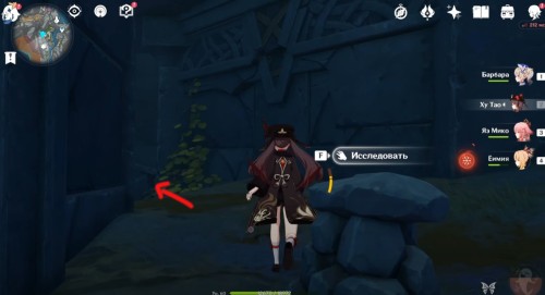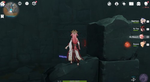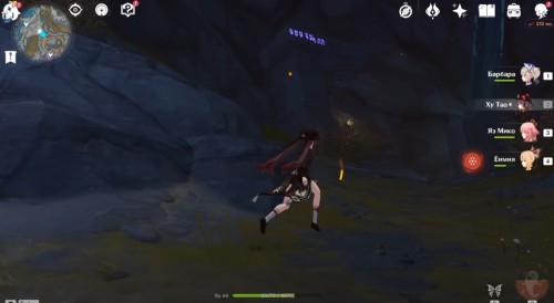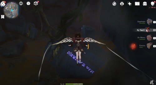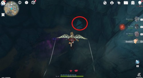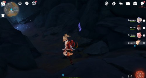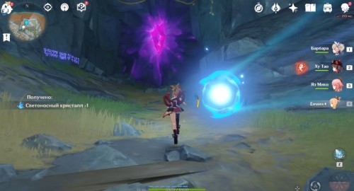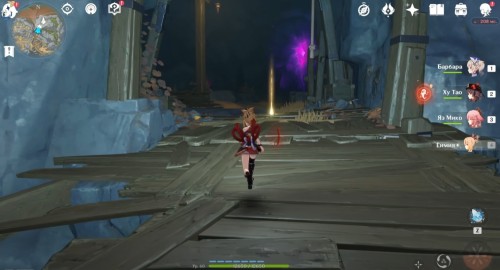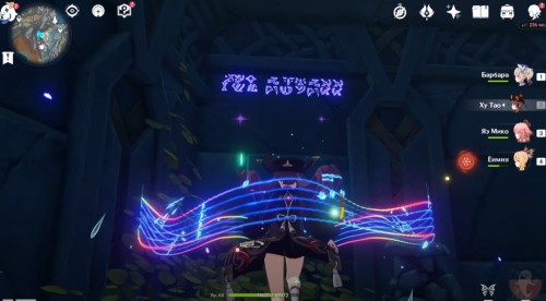 Пройдите по деревянному мостику к фиолетовой стене. Развейте ее с помощью Адъюванта 6-го уровня. Двигайтесь глубже в туннель, и вы увидите с левой стороны фиолетовую надпись. Уберите светоносный камень или разрядите его, а затем разберитесь с Электро и Крио магами бездны (советуем использовать Пиро атаки) и осмотрите руны.