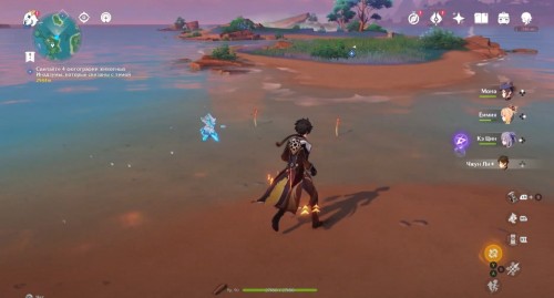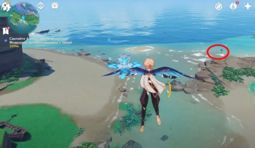Далее переместитесь к восточному телепорту Ватацуми, развернитесь и бегите к мелководью чуть впереди и слева. В воде вы увидите красноперых унаги. Не подходите к ним слишком близко, иначе они спрячутся. Сделайте снимок.