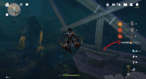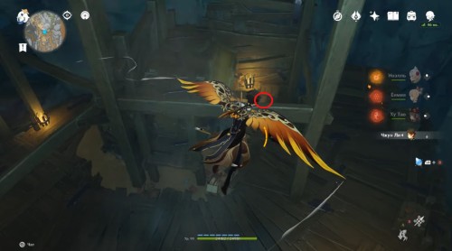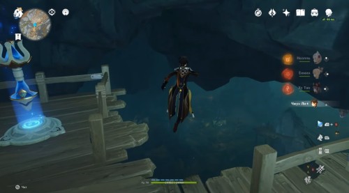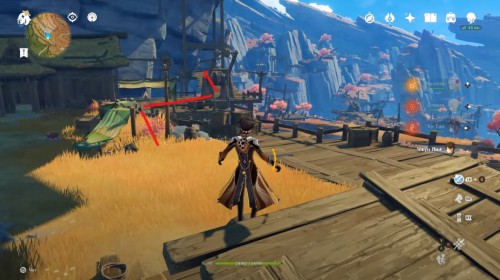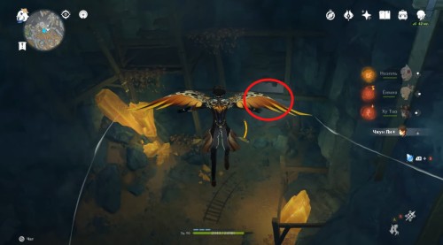 Телепортируйтесь к южной точке быстрого перемещения Основной зоны добычи, бегите вперед и спрыгните с деревянной платформы, а потом сразу же летите вправо, не удаляясь от деревянных помостов, а облетая их по полукругу. Вы увидите проход на земле – спланируйте в него.