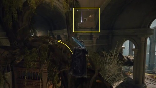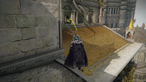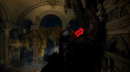 Поднявшись по корню, перейдите на балкон и сверните вправо. Выберитесь наружу и сразу же сверните налево. Прыгните на позолоченную крышу и пролезьте через окошко, на которое указывает желтая стрелка на изображении ниже.