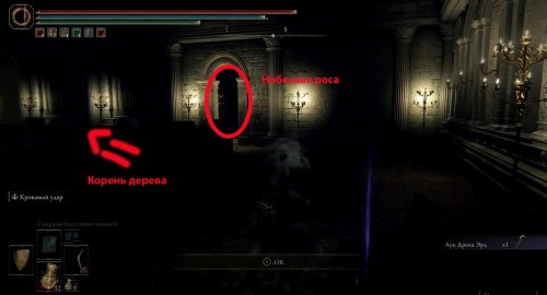 Войдя внутрь, сверните вправо, пройдите мимо сундука (в нем будет лук Древа Эрд) и доберитесь до противоположной стороны помещения. Там будет проход в небольшую комнатку, где можно найти Небесную росу. Слева от входа находится еще один корень. Поднимитесь на него и взберитесь наверх.