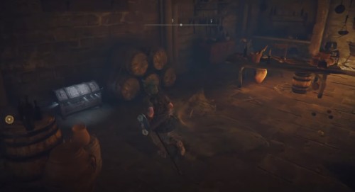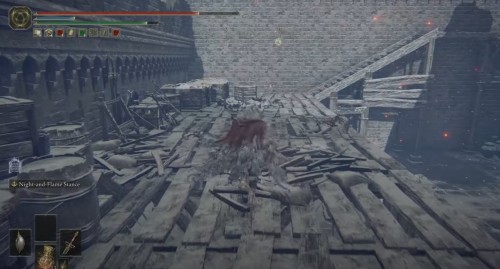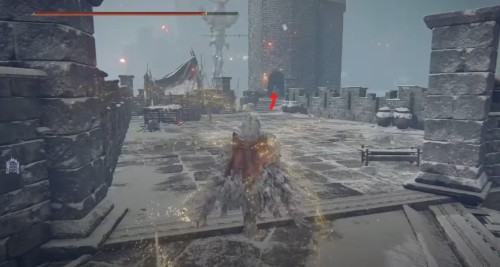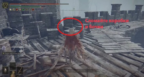 Продолжайте бежать по крепостной стене, расправляясь с врагами на своем пути. Затем разломайте коробки и бочки возле края ограды. Там будет трещина, и вы сможете спрыгнуть вниз на деревянный помост. Далее обойдите башню и поднимитесь по лестнице. Вы снова окажитесь на стене. Идите вперед и войдите в другую башню, разобравшись перед этим с мини-босом.