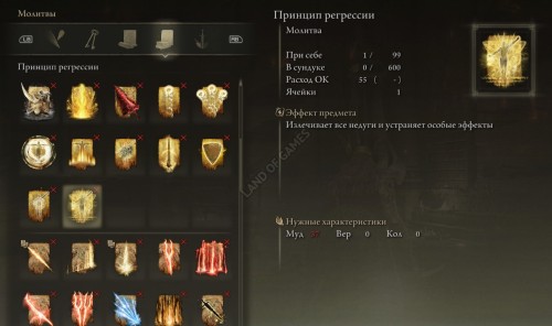 После того как вы передадите молитвослов Корину, вам удастся приобрести у клирика два новых заклинания: Кольца света Радагона и Принцип регрессии. Ознакомиться с их требованиями и эффектами можно на скриншотах ниже.