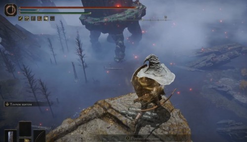 Возвратитесь к месту благодати «Территория мавзолея», а затем тут же поверните направо и бегите к краю обрыва. Вы должны будете увидеть ходячий замок сразу же после телепортации к «костру». Спрыгните с выступа и начните уничтожать «черепа» на ногах чудовища.