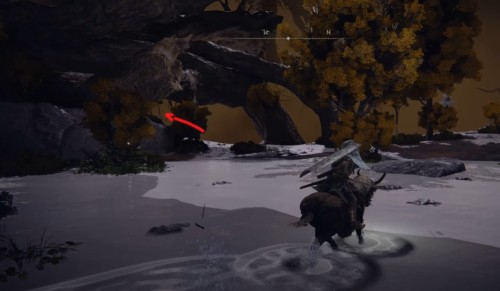 Отметим, что наросты у него находятся не на ногах, а на самом здании, поэтому если у вас отсутствует лук, то мы советуем вам взобраться на один из корней, а потом с ветви спрыгнуть прямо на мавзолей. Примерный маршрут показан на изображениях ниже. Далее просто разрушьте наросты, повалите здание и войдите в него.