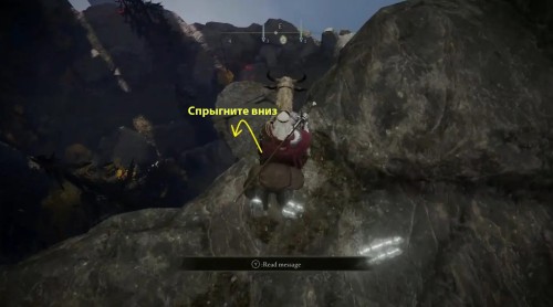 Итак, переместившись к тракту, двигайтесь на север, пока не дойдете до края обрыва. Там спрыгните вниз на каменную платформу. Затем начните спускаться, прыгая с одного каменного выступа на другой. В итоге вы доберетесь до небольшого поселения.