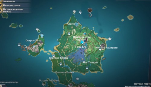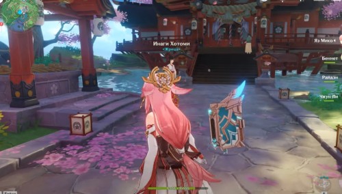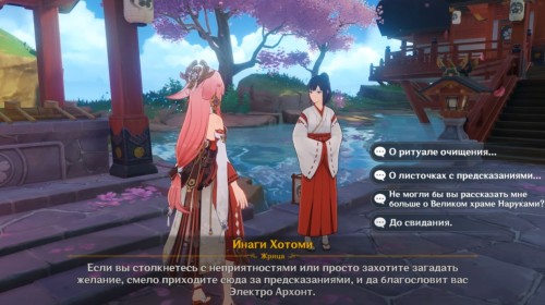 Первым делом вам необходимо будет закончить квестовую цепочку «Очищение священной сакуры» в Инадзуме. Завершив ее финальное задание, отправляйтесь в Великий храм Наруками, расположенный на горе Его и поговорите там со жрицей по имени Инаги Хотоми. Ее расположение показано на скриншотах ниже.